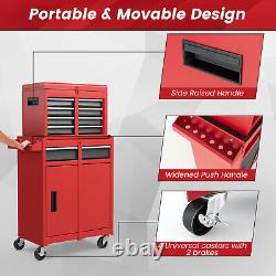 Features: Description: Features: 2-in-1 detachable tool chest meets your different demands 5 drawers in total make your tools well-organized Locking buckle of lid and functional cut-out handle for more convenience Tool hanging board of bottom cabinet for additional storage space Inner shelf of bottom cabinet is removable and 3-level adjustable Easy to move with 4 universal wheels, 2 of which are lockable Side handle is also perfect to store tools Suitable for warehouse, workshop and tool room Specifications: Color: Black + Red Material: Metal Overall Dimension: 59 x 28 x 102 cm (L x W x H) Dimension of Upper Chest: 45 x 24 x 32 cm (L x W x H) Dimension of Bottom Cabinet: 59 x 27 x 70 cm (L x W x H) Net Weight: 17 kg Weight Capacity of Each Drawer: 5 kg Weight Capacity of Top Compartment: 5 kg Weight Capacity of Bottom Cabinet's Countertop: 10 kg Weight Capacity of Inner Middle Shelf: 5 kg Weight Capacity of Inner Bottom Shelf: 10 kg Total Weight Capacity: 55 kg Package Includes: 1 x Upper Chest 1 x Bottom Cabinet 4 x Hooks 1 x Instruction Specifications.