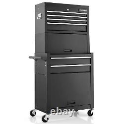 In addition, equipped with 4 flexible universal wheels, including 2 brakes, this tool cabinet offers easy mobility and stability. Moreover, the top section features four tiers of drawers, while the bottom section includes two spacious drawers. Additionally, the bottom cabinet is equipped with four hanging hooks and a sturdy handle for easy access and transportation of your tools.
