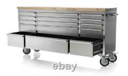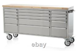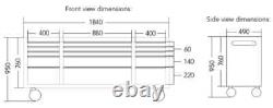 15 drawers with heavy duty roller bearings. Drawers lined with non-slip rubber sheet. 35mm Pine Wood Top Surface. 45Kg (100lbs) Maximum Drawer Weight. Tubular locks with key included. Surface Finish = Stainless Steel & Solid Pine Work Surface. Without casters and handles (mm) = 1840 x 490 x 760 (W x D x H). With casters and handles (mm) = 1990 x 490 x 950 (W x D x H). Maximum Draw Weight = 45Kg (100lbs).Drawer Sizes (W x D x H) (mm). 400 x 490 x 60.