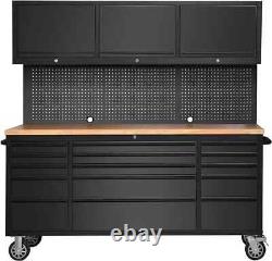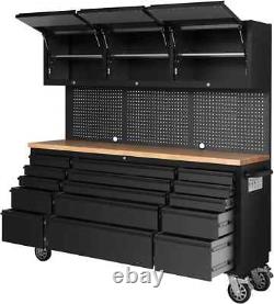 The handcrafted wooden top and brushed steel finish not only makes it suitable for rugged workshop use but also enhance its aesthetic appeal in home environments. Three spacious upper cabinets provide additional room for tools and accessories.