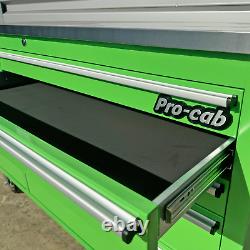 Introducing our top-tier Pro-cab Green stainless steel Tool Cabinet. This 55-inch chest is perfect for various settings including homes, workshops, automotive, and trades. Its four large polypropylene wheels, each equipped with secure locks, ensure easy movement within your workspace.