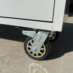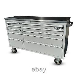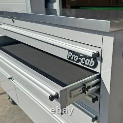 Introducing our top-tier Pro-cab Grey stainless steel Tool Cabinet. This 55-inch chest is perfect for various settings including homes, workshops, automotive, and trades. Its four large polypropylene wheels, each equipped with secure locks, ensure easy movement within your workspace.