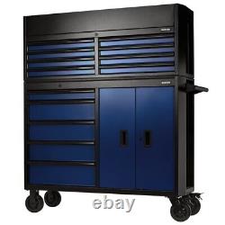 For manoeuvrability, there is a steel handle and four hardy castor wheels, two fitted with brakes. Each unit has an integral lock for security, supplied with two keys. 1 x BUNKER® Combined Roller Cabinet and Tool Chest, 13 Drawer, 52, Blue. Static drawer weight capacity: 30kg Top tray weight capacity: 75kg Shelf weight capacity: 30kg Dimensions: W 1,310 x D 458 x 1,572mm Weight: 143.8kg.