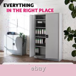 In a workshop, warehouse or production facility, office, cellar, archive or home. You're bound to be impressed by their solid and durable steel sheet construction. The 3 individually adjustable shelves are perfect for storing files and binders. The sheet steel body and doors, reinforced by their box construction, feature a durable powder-coated stove enamel finish and an elegant neutral colour so they can easily be incorporated into any room. Ensure your files are in order and safe from prying eyes with this filing cabinet from tectake. Lockable metal filing cabinet with 4 shelves. Easy to assemble - stable position. Reinforced hinged doors (opening angle: 130°) with sound-dampening rubber buffers. Easy to clean interior thanks to flat shelves.Closes using a turning handle and features a safety cylinder lock with two keys. 140 x 90 x 40 cm. Shelves (WxD): 89.5 x 36 cm. Max load capacity: 40 kg per shelf.