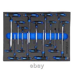 The 32-piece Screwdriver Set in Drawer 4 includes a variety of screwdrivers, including standard, Phillips, high-pressure, hex key, and precision screwdrivers. Drawer 5 - 18 piece T-Handle Key Wrench Set. The 18-piece T-Handle Key Wrench Set in Drawer 5 features T Type Torx and Hexagon Key Wrenches in various sizes (T10-T50 and 2-10mm, respectively). These tools are ideal for applications that require torque and precision, such as assembling and disassembling machinery, furniture, or other items with Torx and Hexagon socket screws. Drawers 6 & 7 - Tool Storage.