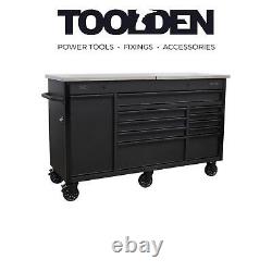 Two cylinder locks allow drawers and power tool charging drawer to be locked separately. Each drawer features stylish black anodized heavy-duty drawer pulls and non-slip liners.Power tool charging drawer fitted with 2 x 230V sockets & 2 x 5V 2. Specification (W x D x H). Overall Size: 1600 x 584 x 988mm. Medium Drawer (x1): 1036 x 482 x 71mm. Medium Drawer (x3): 641 x 482 x 70mm.