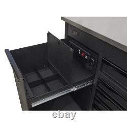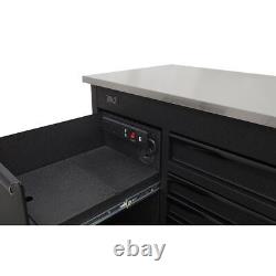 Stainless steel'flip-top' split providing a work surface and additional storage. Two cylinder locks allow drawers and power tool charging drawer to be locked separately. Each drawer features stylish black anodized heavy-duty drawer pulls and non-slip liners. Overall Size (W x D x H): 1120 x 584 x 990mm. We will dispatch items within 48 working hours of the order being processed.