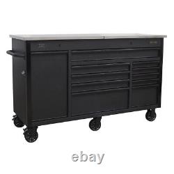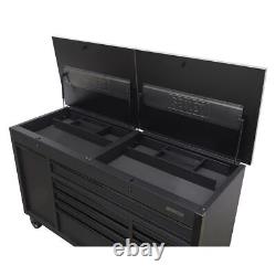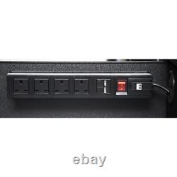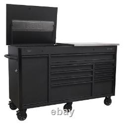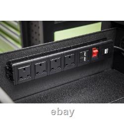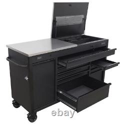 Power tool charging drawer fitted with 4 x 230V sockets & 2 x 5V 2.4A USB sockets. Mounting points to fit additional four gang power strip - Model No. Stainless steel'flip-top' split equally into 2-sections providing a work surface and additional storage. Two cylinder locks allow drawers and power tool charging drawer to be locked separately.