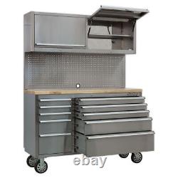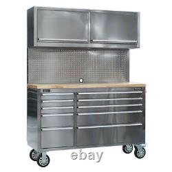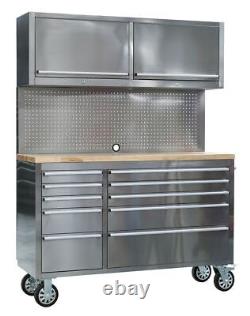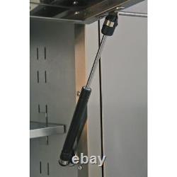 Each drawer features aluminium pull handles and non-slip liners. Four large castor wheels, two fixed and two swivel, that include brakes. Supplied with a pegboard back panel - ideal for hanging tools - and two gas strut wall cabinets for added storage. Cabinet supplied with a heavy-duty side handle for comfort and control when manoeuvring. Supplied with locks and two keys each.