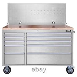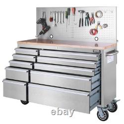 Allows easy and quick access to your tools. Excel 57inch Stainless Steel 10 Drawer Roller Tool Cabinet & Workbench with Pegboard. Excel 10 Drawer Roller Tool Cabinet Workbench. Durable Stainless Steel Construction: Crafted from high-quality stainless steel, this tool chest offers superior strength and long-lasting durability, ensuring it withstands the toughest work environments. Spacious 10-Drawer Storage: With 10 drawers of ample size, this chest provides an organized solution for all your tools, keeping everything in place and easily accessible.