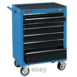 Armoire à roulettes à 7 tiroirs avec poignée de traction fabriquée en tôle d'acier avec finition revêtue de poudre. Équipé de deux roulettes fixes et de deux roulettes pivotantes robustes avec frein. Les tiroirs sont équipés de glissières à roulement à billes pour un fonctionnement plus fluide et d'un revêtement en mousse protectrice. Chaque armoire à roulettes est équipée d'un système de verrouillage intégré sécurisé.